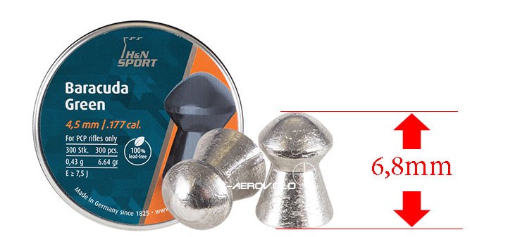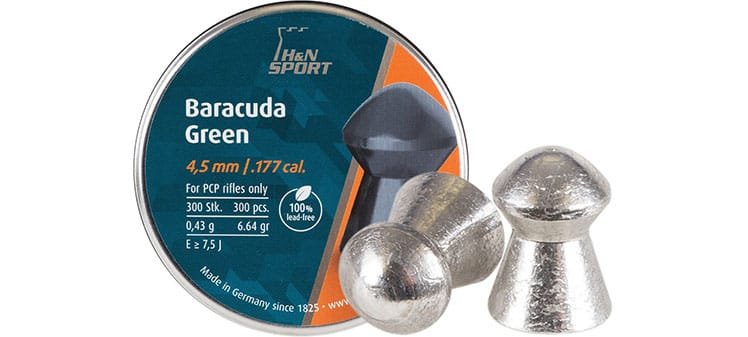 H&N Baracuda Green 4.5mm. Βολίδες της H&N πολύ καλής ποιότητας με κεφαλή πομπέ προς μυτερή. Είναι χωρίς ραβδώσεις σε μεταλλικό κουτάκι των 300 τεμαχίων. Έχουν Βάρος 0.42 gr (6.48 grains). Είναι κατασκευασμένες χωρίς μόλυβδο, ιδανικές για βολές σε μακρινές αποστάσεις.