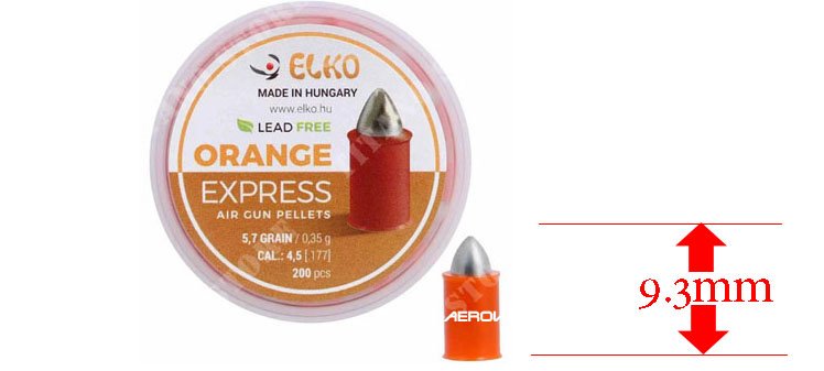 ELKO ORANGE EXPRESS 4.5mm/200. Βολίδες της εταιρίας ELKO κατασκευασμένες από μη τοξικό πλαστικό και μόλυβδο. Είναι σφαίρα σχεδιασμένη για όπλα μέτριας ισχύος και ισχυρής πρόσκρουσης. Επιπλέον, το βάρος και ο σχεδιασμός της βοηθούν την σκοποβολή σε μεγαλύτερη απόσταση και με μεγαλύτερη ταχύτητα. Ακόμη, η διεισδυτικότητα της είναι εξαιρετική, ειδικά στην περίπτωση σκληρών αντικειμένων, καθώς δεν παραμορφώνεται όπως οι κλασικές σφαίρες από μαλακό μόλυβδο. Κατά την πρόσκρουση, το πλαστικό περίβλημα αποσπάται και μόνο ο πυρήνας από ψευδάργυρο προχωρά προς τα εμπρός.