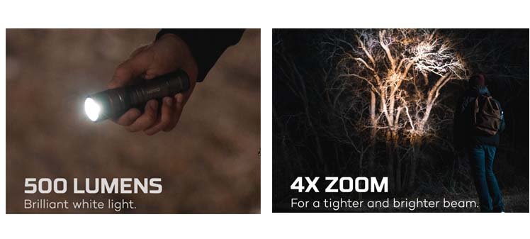 -Υψηλή απόδοση 500 lumens – μέγιστη διάρκεια λειτουργίας 2 ώρες, εμβέλεια δέσμης φωτός μέχρι 146 μέτρα