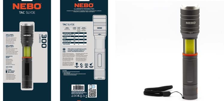 NEBO TAC SLYDE (300 Lumens). Ο φακός Tac Slyde™ έχει απόδοση 300 lumens, ζουμ 12x και 5 επιλογές φωτισμού. Διαθέτει φως εργασίας C.O.B. Ο φακός Tac Slyde™ έχει απόδοση 300 lumens, ζουμ 12x και 5 επιλογές φωτισμού. Διαθέτει φως εργασίας C.O.B. με 3 επιλογές φωτισμού που περιλαμβάνει κόκκινο φλας έκτακτης ανάγκης. Ο NEBO TAC SLYDE (300 Lumens) διαθέτει ισχυρή μαγνητική βάση που σας επιτρέπει να φωτίζετε ενώ έχετε ελεύθερα τα χέρια και το λουράκι μεταφοράς σας επιτρέπει την εύκολη μεταφορά του.