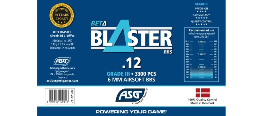 Airsoft Μπίλιες Blaster 0.12g/3300 6mm. Μπίλιες Grade III της ASG 6mm, ειδικά κατασκευασμένες για το παιχνίδι του airsoft. Έχουν βάρος 0,12gr και είναι σε μπουκάλι των 3300 τεμαχίων.